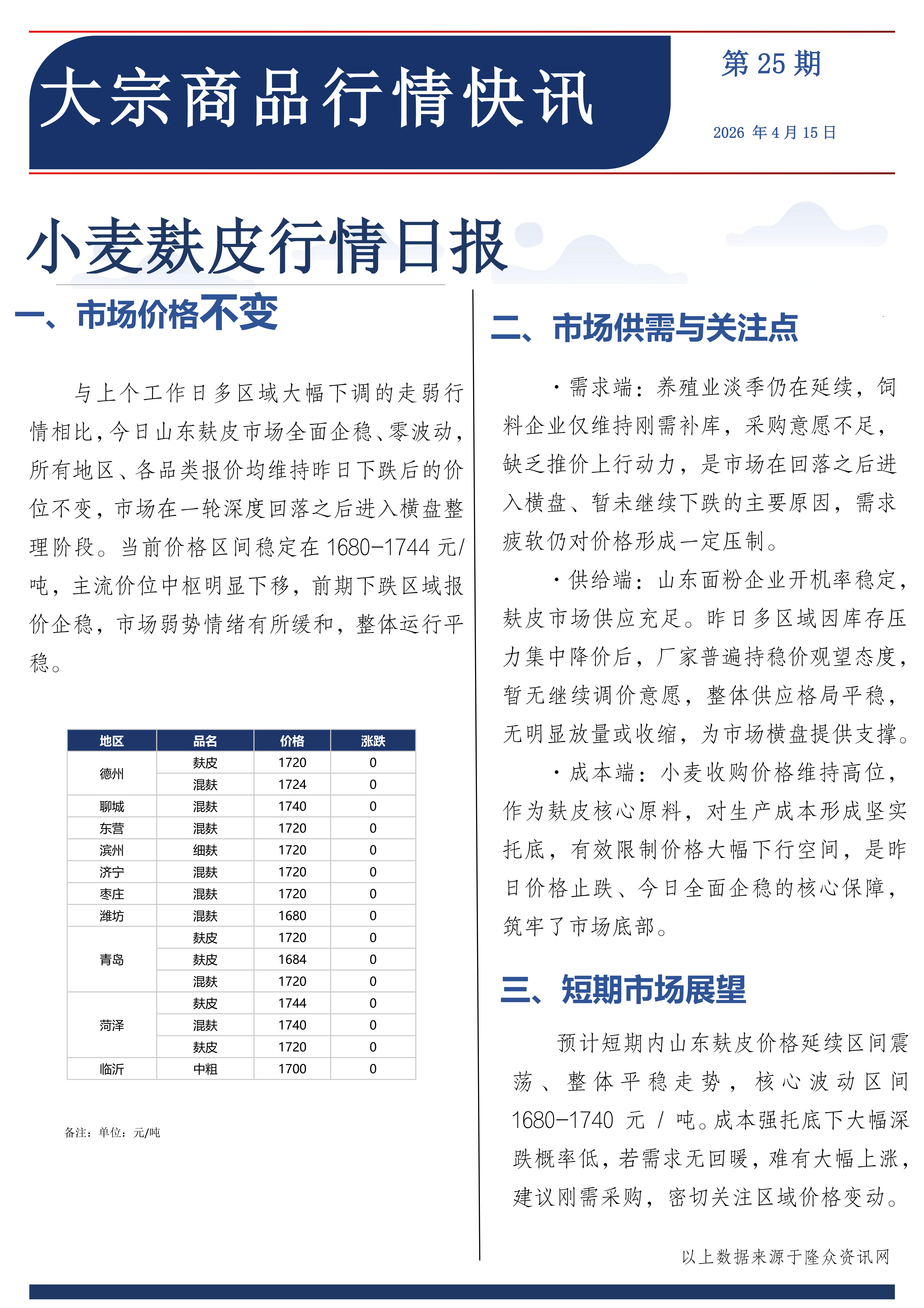小麦麸皮行情日报2026.4.15